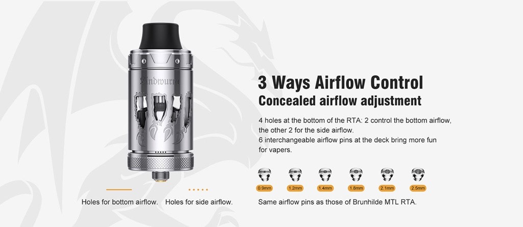 Der Lindwurm RTA von VapeFly wurde mit Lasergravur und einer Beschichtung gegen Korrosion hergestellt. Der Tank hat 5ml Liquid Kapazität und ein einfaches Top-Fill-System. Wie bei dem Brunhilde MTL RTA hat der Lindwurm 6 austauschbare Airflow-Pins (0,9mm, 1,2mm, 1,4mm, 1,8mm, 2,1mm, 2,5mm), um die optimale Einstellung für jeden Vaper zu bringen.