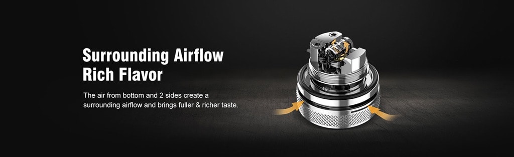 Es gibt 4 Löcher an der Unterseite des RTA, 2 Löcher steuern den unteren Luftstrom und die anderen 2 Löcher steuern die seitliche Luftführung. Der Lindwurm RTA bietet euch ein solides Single Coil Deck, guten Geschmack und satten Dampf!